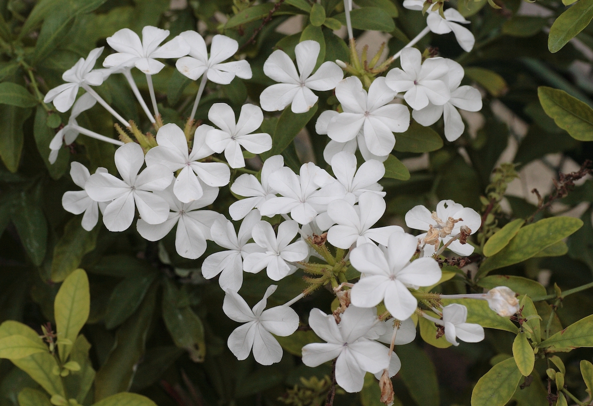 While mostly notably known for its iconic blue flowers, plumbago can also be found in white, as in the ‘Alba’ cultivar shown here. Credit: PFMphotostock