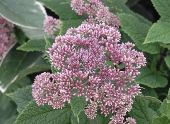 Joe-Pye weed produces large lavender-purple blooms in the summer and early autumn. It bears narrow leaves up to 10 inches long on a tall, erect stem. The domed flower head is made of several branches, each with small florets.